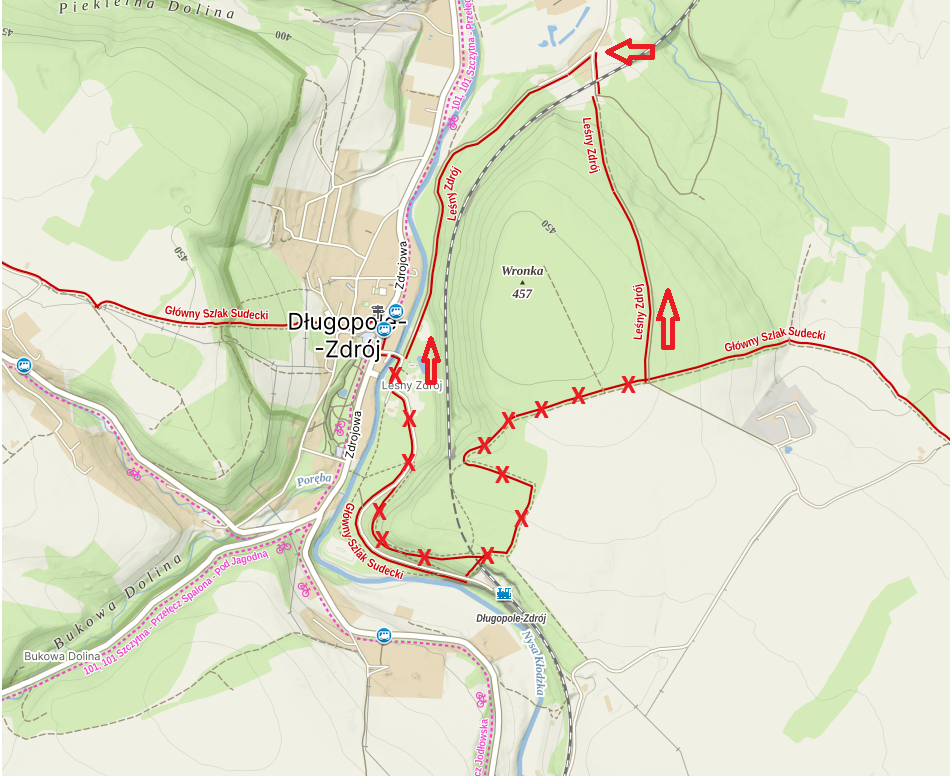 Nadleśnictwo Bystrzyca Kłodzka informuje o czasowym zamknięciu szlaków turystycznych pieszych: - Pieszego żółtego prowadzącego z Polanicy Zdrój do Bystrzycy Kłodzkiej tzw. „Droga Stanisława” w Leśnictwie Stara Łomnica, na odcinku Pokrzywno-Huta, ze względu na prace gospodarcze od dnia 28.01.2026 r. do dnia 30.06.2026 r. - Nadleśnictwo Bystrzyca Kłodzka, informuje o czasowym zamknięciu odcinka szlaku turystycznego pieszego czerwonego „Główny Szlak Sudecki” w Leśnictwie Długopole Dolne, prowadzącego z Sanktuarium Marii Śnieżnej do Schroniska na Jagodnej, ze względu na prace gospodarcze od dnia 13.04.2026 r. do dnia 30.09.2026 r. Mapa z proponowanym obejściem w załączniku. Za utrudnienia przepraszamy. Link do mapy https://dolnoslaskie.szlaki.pttk.pl/mapa Mapa z proponowanym obejściem w załączniku. Odcinek żółtego szlaku turystycznego, który jest czasowo wyłączony z użytkowania zaznaczono kolorem czerwonym, proponowane obejście zaznaczone kolorem czarnym.
